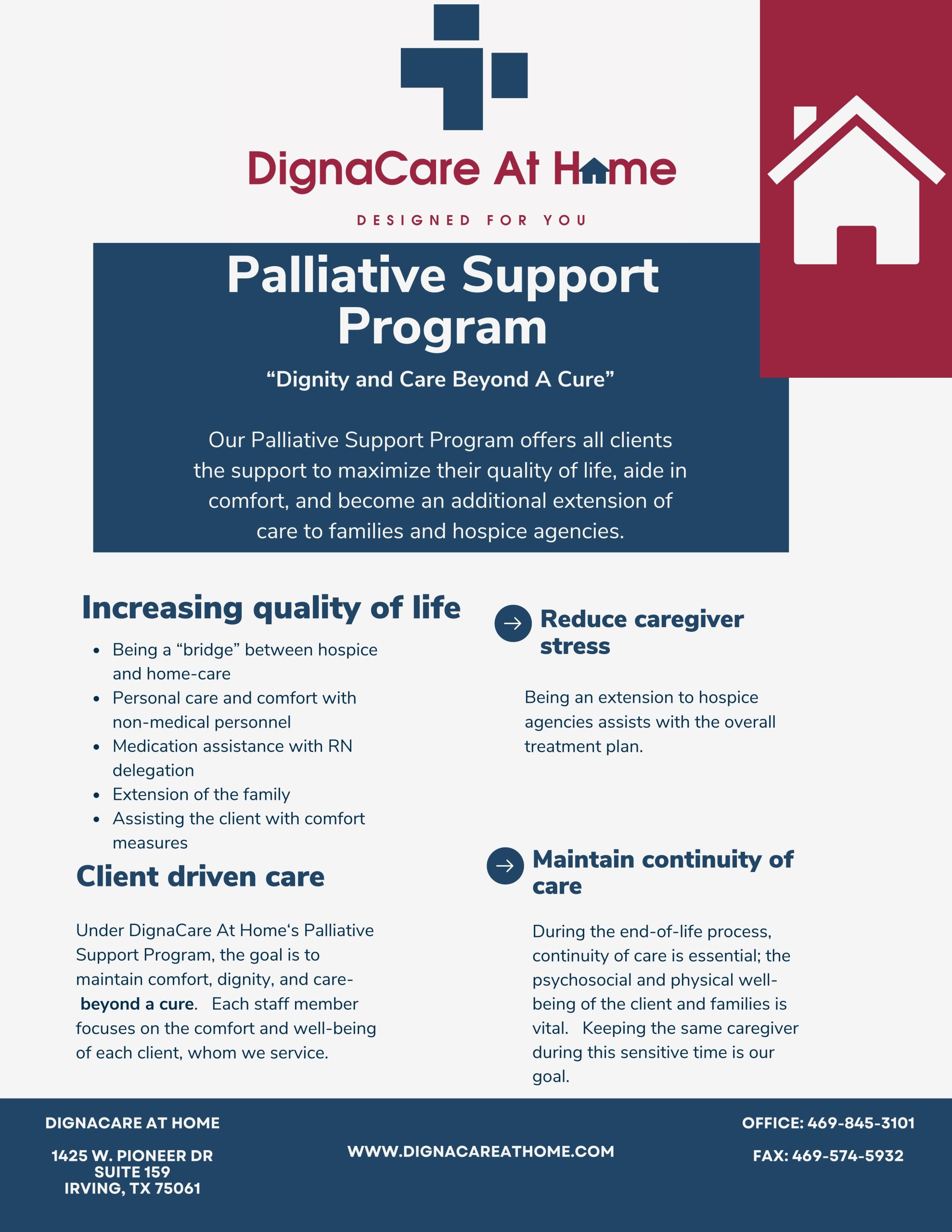 DignaCare At Home’s Palliative Support Program is founded upon the principles of compassion, dignity, and holistic care. Through our collaborative approach, comprehensive support, and unwavering commitment, we aim to make a positive impact on the lives of individuals facing life-limiting illnesses. Our mission is to enhance quality of life, empower patients and their families, and provide the care they deserve during this difficult journey.